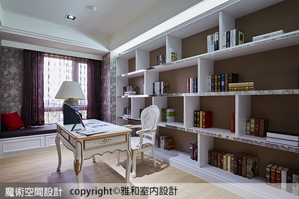 5.書房延續了公領域的古典元素,書桌後方一整片的開放式書架,令房內瀰漫濃郁的書香人文氣息,而雅硯設計還在靠窗處設置低矮軟榻,於是使用者在讀書疲累之餘,能夠坐在窗邊看風景放鬆心情,書房也因此兼具了充電與休憩的功能。