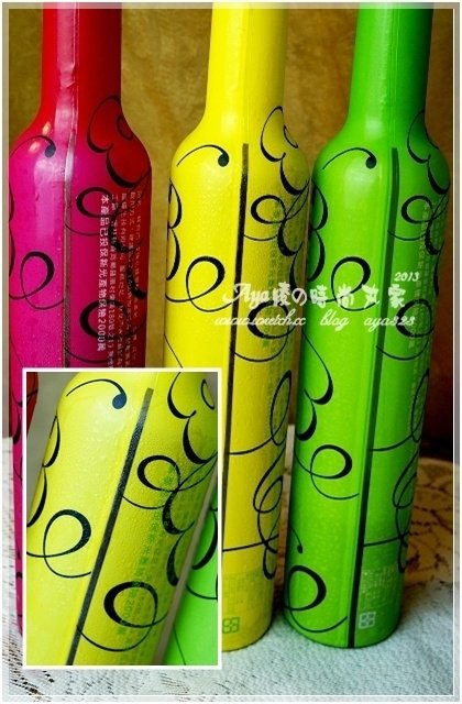 毎一個瓶身處有一條透明的線 有以線條的方式拉出四個間距