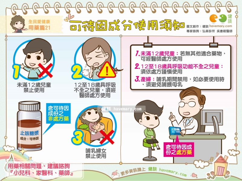 可待因 (codeine) 具有良好的鎮咳、止痛之效,也因此為止痛藥、止咳糖漿的常見成份之一;然而,有鑒於國際間發佈多起兒童因使用可待因成分藥物導致呼吸系統不良之警訊,因此食藥署已於今(2017)年7月公告,含有可待因之非處方藥物(指示用藥,無需醫師處方籤即可於藥局購買之藥物)禁止12歲以下兒童及哺乳婦女使用!提醒民眾於國內外購買藥品時,亦應留意藥物成分,以免引起身體不適。