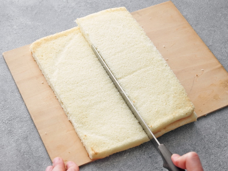 將烤得很平整的海綿蛋糕切成3塊長方形。