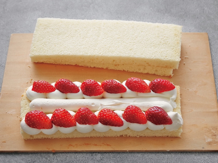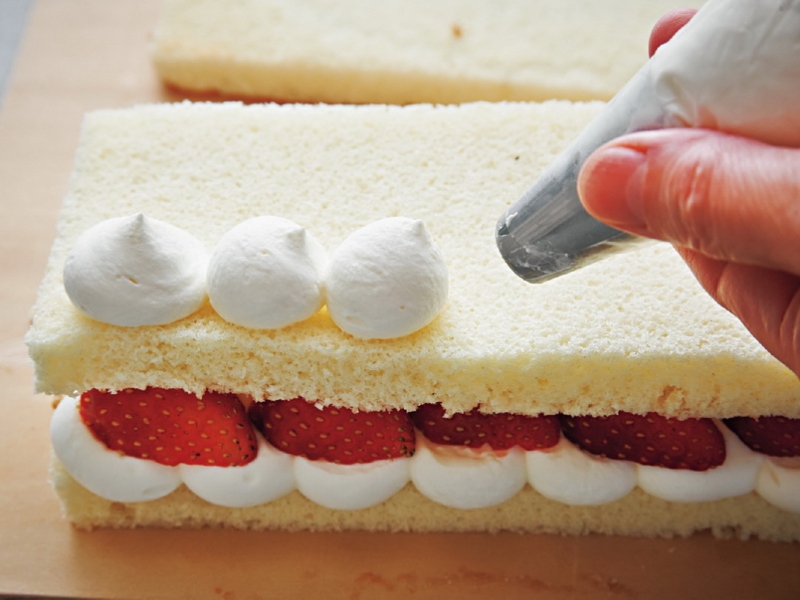 7.再疊上1片海綿蛋糕,擠上發泡鮮奶油之後,以草莓裝飾。再重複做1次。