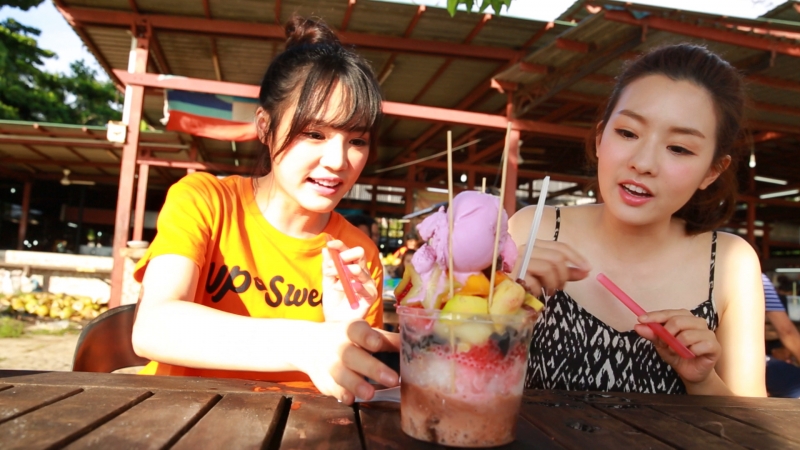 兩人接著到達擁有世界前三大日落晚霞美景的「丹絨亞路海灘」,吃著馬來西亞的ABC冰等待夕陽,沒想到吳心緹竟挖到神似蛤蠣外型的配料,疑惑冰裡怎麼會放海鮮,一入口發現其實是切對半的葡萄,讓一旁的陳語安大笑,忍不住指著她說:「真的是笨!」