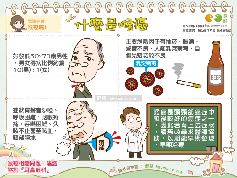 曾梓展醫師提醒,喉癌是頭頸部的癌症中預後比較好的癌症之一,若能在早期接受治療,一般而言預後效果相當不錯;因此若有上述異常症狀時,請務必尋求醫師診治。