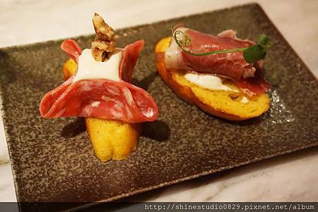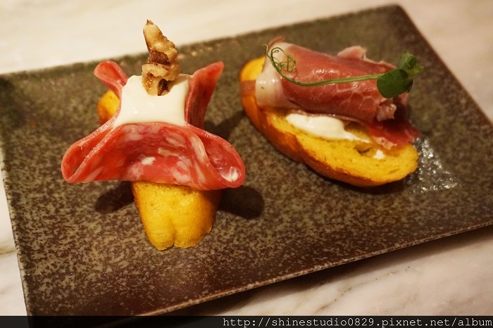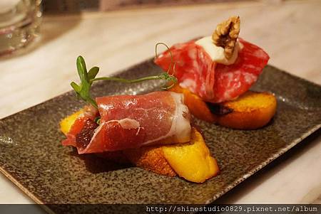 意式普切達臘腸 , 奶油乳酪,帕馬火腿佐洋蔥醬