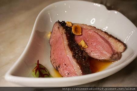 整體鴨胸的肉質是很嫩的 , 特別的是主廚以水果作為醬汁