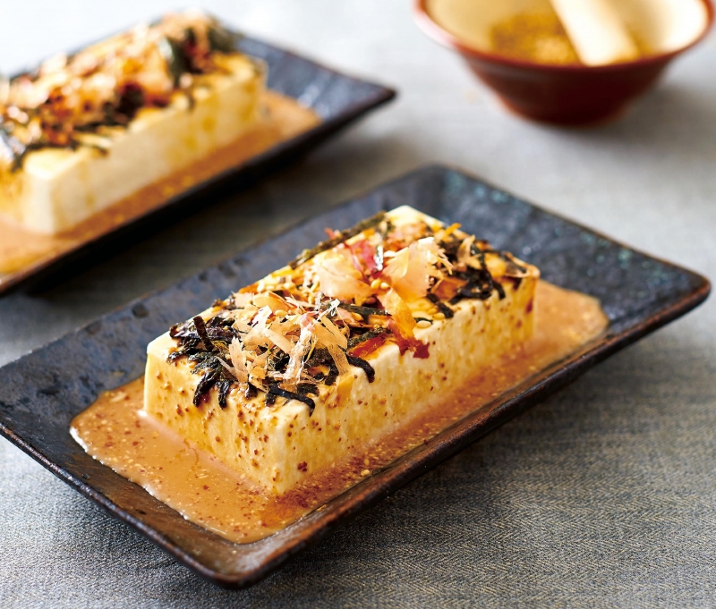 3 絹豆腐切塊,盛在碟上,淋上醬汁,撒上紫菜絲及鰹魚絲。