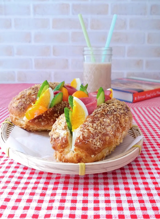 4. 麵包剖開2/3深度(不切斷),擠進美乃滋,夾入火腿片、雞蛋切片、小黃瓜及小番茄片,即完成。也可以自己隨意配料,滋味一樣好吃。