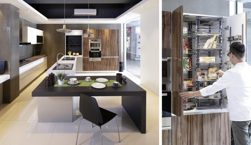 ►櫻花整體廚房Shinelux系列融合極簡與華美的外觀,深獲Jacques喜愛。大型儲物櫃搭配旋轉層架,提供易於拿取的大量收納空間。(場地/櫻花廚藝生活館 世貿店)
