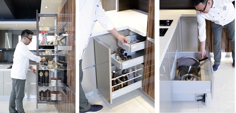 ►(左)利用零散空間設置的側拉欄。 (中)可彈性調整的格柵與內抽。(右)利用踢腳板位置加深抽屜高度增加收納空間。(場地/櫻花廚藝生活館 世貿店)