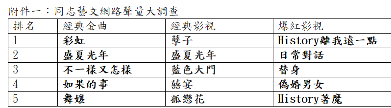 - 「同志藝文網路聲量大調查」由網路溫度計觀測上萬個網站頻道,包括新聞頻道、Facebook、PTT及各大討論區、部落格等,在2016年8月20日至2017年8月21日期間討論文本的統計。希望透過這項有趣議題的發布,引發社會大眾探討同志藝文的興趣,並增加友善互動交流。