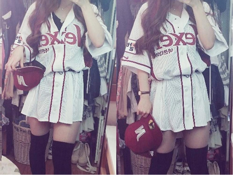 把過大的棒球衣做點變化,在腰間處繫上細繩做造型,把衣服長度調整到大腿處,領口可以直接打開走隨性風,搭配膝上襪打造,這種棒球衣的性感穿搭絕對吸睛。