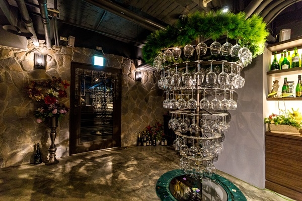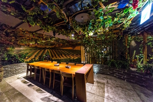 其中最吸睛的部分,就是老闆特別仿效法國酒莊設計的葡萄園田野風情包廂,原汁原味的法國莊園佈置,視覺延伸的葡萄樹帶著濃濃的法式風情,坐在葡萄藤下用餐彷彿置身法國波爾多的葡萄莊園般,相當浪漫,可謂酒不醉人人自醉,置身其中心情不自覺放鬆許多。而公共空間中也布滿了葡萄藤蔓裝飾,各式與酒有關的陳設,成為喜愛葡萄酒的愛酒人士必朝聖的餐廳。