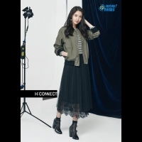 H:CONNECT延續上半場華麗搖滾派對的輕龐克風格,捨去柔和的粉嫩色系,秋冬新裝以強烈對比的黑、白、灰色系為主,風格俐落搶眼,塑造出女性自信個性的裝扮,古典碎花元素搭配時髦中性剪裁,將復古氛圍與率性力量巧妙地結合,讓潤娥增添了不少成熟的女人味,展現優雅個性的造型,顯得更加迷人。