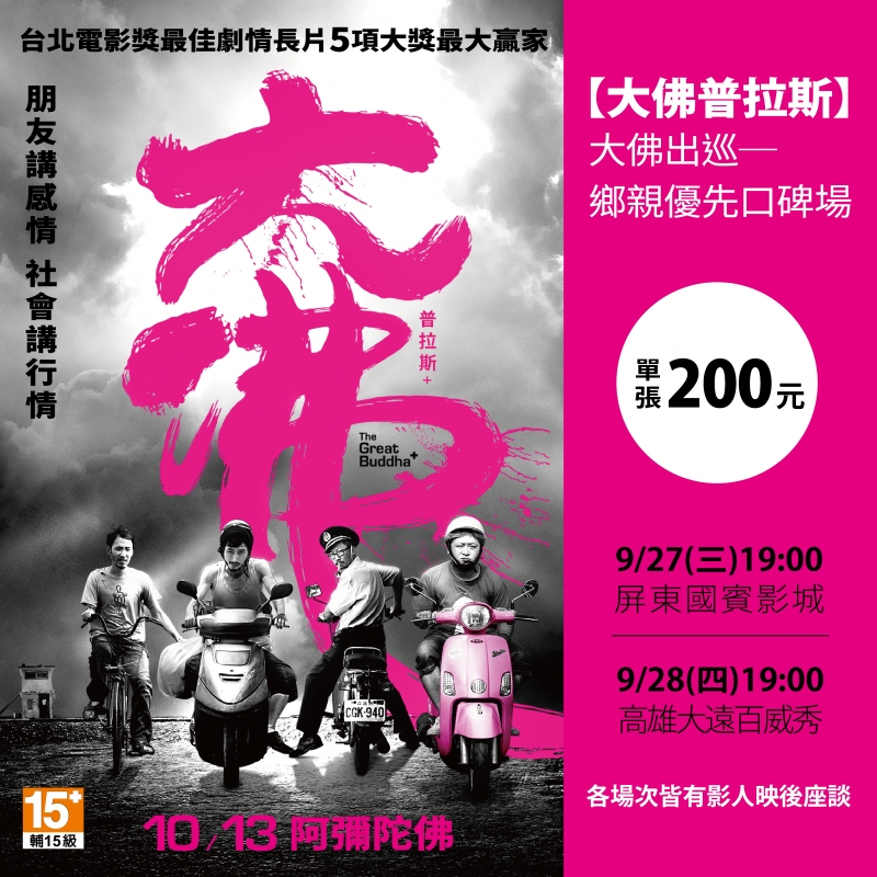 甫自多倫多國際影展載譽歸國的啊堯導演,今天帶來《大佛普拉斯》的正式版海報,在電影中四個靈魂人物以台灣最重要的交通工具--機車和腳踏車露臉,海報文案「朋友講感情,社會講行情」加上呼應正式預告中納豆的粉紅色歐兜拜,讓網友笑噴紛紛大讚「很機車」!北美巡演之後,啊堯導演也將下鄉「大佛出巡南部鄉親場」從9/27-29到屏東、高雄、台南三地,因為這三個地區正好是男主角莊益增、配樂林生祥與啊堯導演的家鄉,屆時導演與兩位男主角、生祥老師也將與當地觀眾見面搏感情!高雄、屏東購票請洽博客來售票網,台南場請洽台南國賓影城光芒影展。
