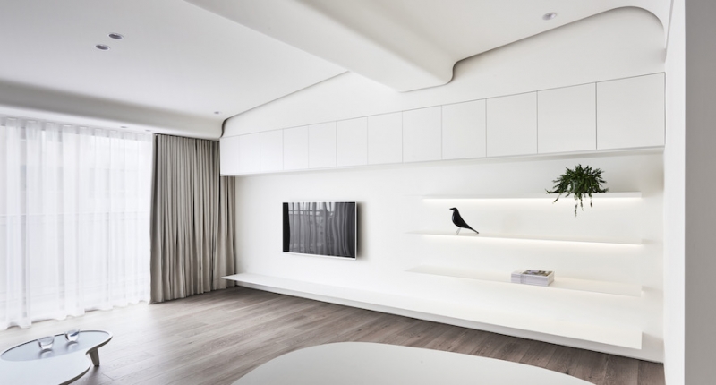 北歐建築的設計簡單而溫暖,採用大量白色與噴漆手法,使屋內風格清麗而素雅。弧狀的設計巧妙地將梁柱包覆,軟化直角帶來的剛硬線條,令視覺上充滿層次,也為空間帶進流動感。電視的黑對比牆面的白,和棕色系木頭地板相互呼應,在清透的色調中帶入沉穩與安逸。