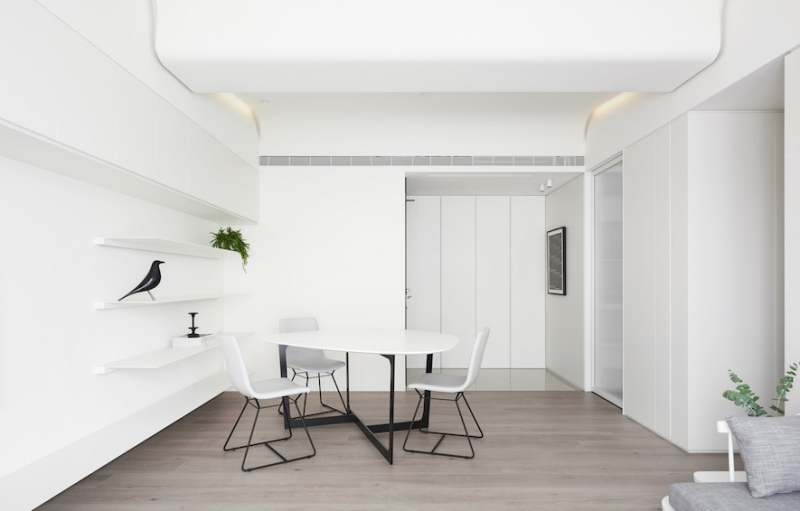 同樣素雅色的淺中灰沙發搭配開放式置物架和餐廳的設計,使生活不僅擁有便利性,無形中也放大了空間,自然地隔絕都市的歡騰與喧囂,在靜謐中擁抱白的簡單與樸實。