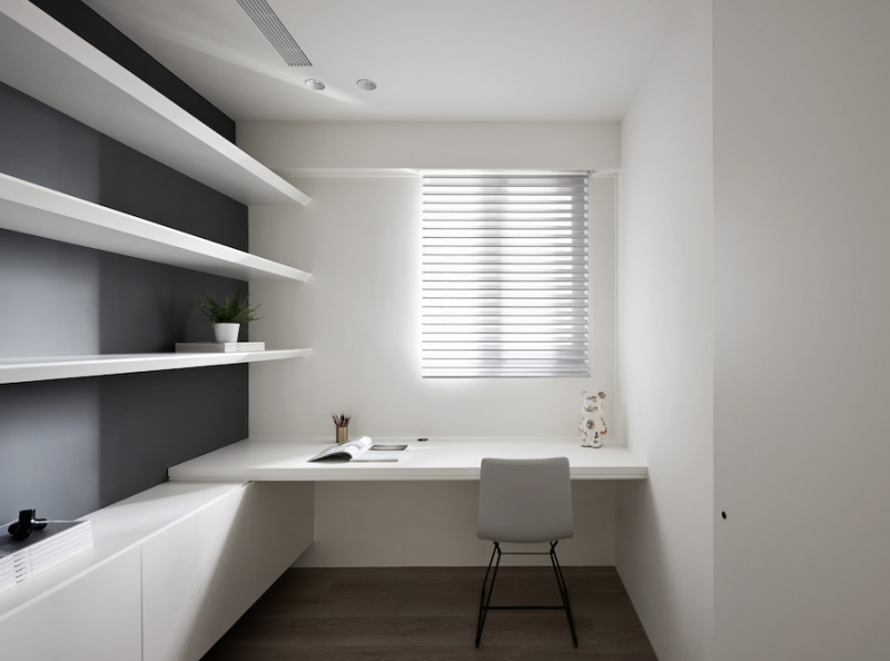 書房的柔紗捲簾讓陽光滲透帶有朦朧感,搭配書櫃灰色牆面與光影的變化,使空間在清爽中多了一分沉靜,令人放心的專注於文字的世界或辦公的氛圍中。