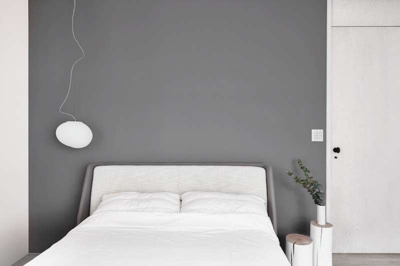 臥房的設計仍舊秉持簡約風格,搭配床頭旁蜿蜒而下的白色精緻吊燈,如天空中小巧的雲朵般點綴著灰色天空,增添趣味,亦象徵著男主人堅實的臂彎與女主人細致的柔美緊緊相依,牽起人生中最幸福的羈絆,讓人在空間裡達到絕對的放鬆。