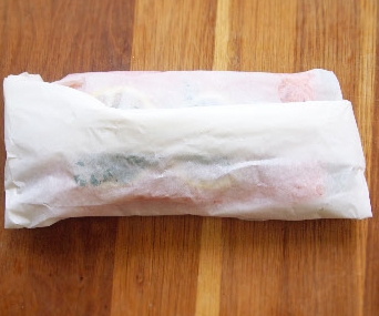 4 放上檸檬片和蒔蘿。將紙摺好包起。(c-d)