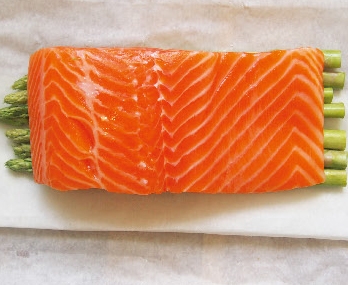 3 將鮭魚放在蘆筍上,撒上1茶匙鹽、1/4茶匙黑胡椒碎和1茶匙橄欖油。(b)