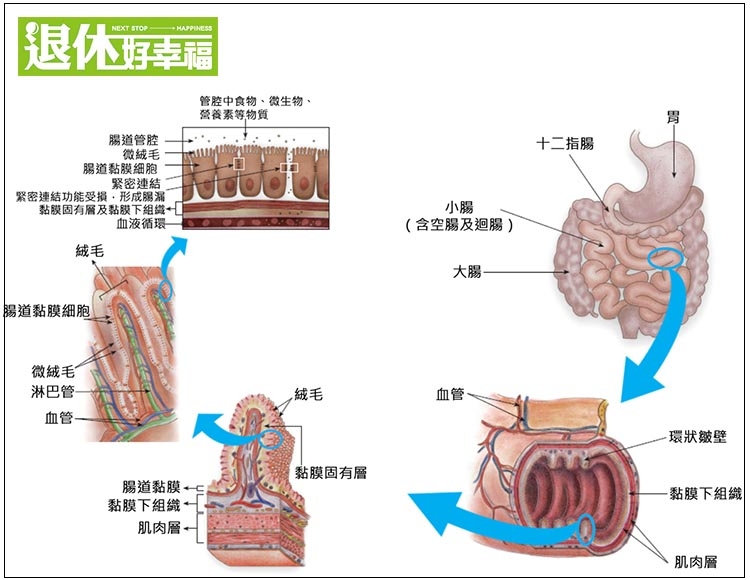 腸道的黏膜,是由一層薄薄的黏膜細胞(enterocyte)構成,黏膜細胞會分泌黏液到黏膜表面,而黏膜細胞底下則是黏膜固有層(lamina propria),再往下則是黏膜下組織(submucosa)與肌肉層等。