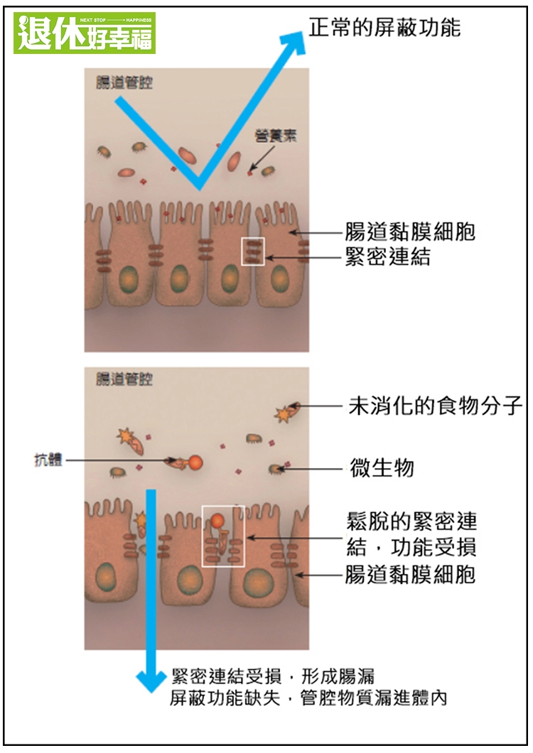 緊密連結的破洞或功能異常,造成細胞間的縫隙變大,腸道通透性因而增加(Increased intestinal permeability),這就是所謂的「腸漏症」(Leaky gut syndrome)。