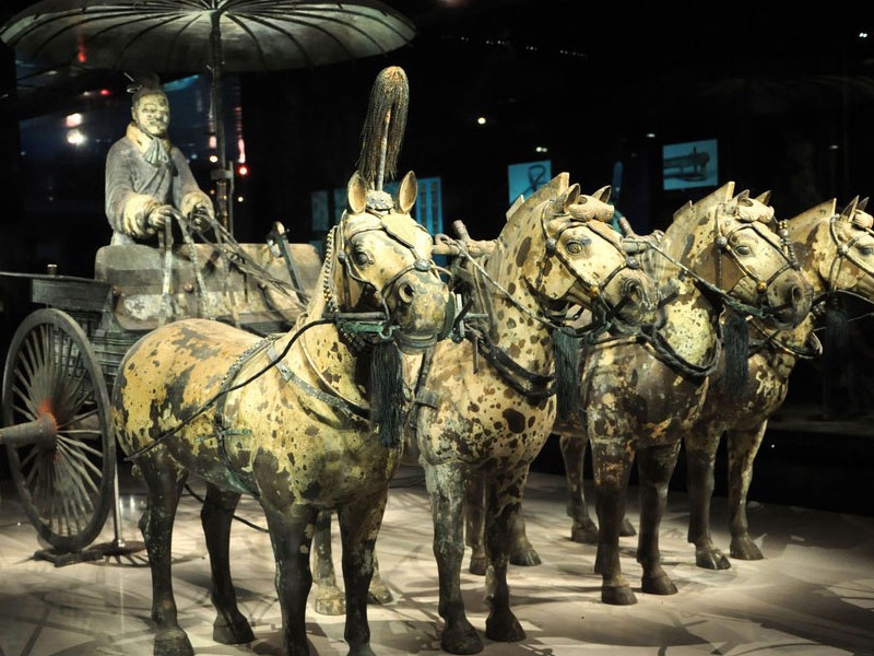 從分析秦始皇陵的作品中,會發現從未見過的「以人和動物為主題」來表達「藝術目標」的創作形式,除了發現驚人數量的兵馬俑外,另一個讓人亮眼的部分為百戲俑、銅車馬、青銅水禽等製作工藝。其製作工藝所蘊含的文化因素,宛如橫空出世般出現,這些現象引導我們從更大的時空範圍內,去進行綜合性思考。以考古角度被初步認定這些物品出現的原因,是意味著當時中西文化交流的運行。若將其分析追朔到張騫通西域之前,中西文明其實已經有了比較深入的交流曆程。