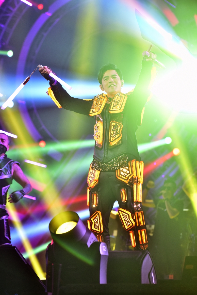 粉絲引頸期盼的「地表最強」台北演唱會28日於小巨蛋舉行,一開場就直接把歌迷拉到外太空,舞台上巨型盔甲LED多層次浮空矗立,太空人漫步於宇宙之間,周杰倫搭乘太空船穿越時空艙門而來,歌迷尖叫聲不絕於耳!他以一襲全新「黃金電幻戰士裝」英姿煥發的從「伸縮時空大圓艙門」現身,一連帶來「英雄」、「雙截棍」等歌曲,在18名舞者、2名健身教練同步揮舞光劍的節奏搭配下,展現如虹氣勢!緊接著周董又以另一套嶄新的「華麗金屬流蘇裝」演唱「世界末日」、「開不了口」等抒情歌曲,調整過的曲目及全新亮相的服裝,在一開場就一新歌迷耳目、引領全場粉絲進入他多元的音樂世界!