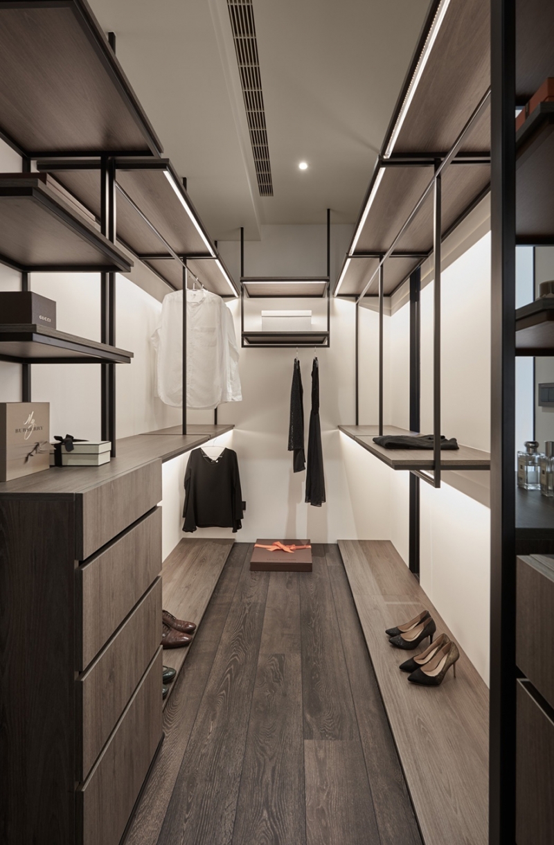 接著從公共領域來到主臥房,除了擺放床的空間之外,後方還特別為女主人設計隱私性極高的衣帽間,大大滿足她的收納需求,其中也曾經發生一些小插曲,包括衣帽間是否要加裝門片以及光線該如何引入室內,業主本來因其他考量有些猶豫,但在現場監工的過程中,一步步發現設計師的看法與現實相符,便決定全權交由Ivy和Amanda負責,結果出爐時果然沒讓他們失望,紛紛表示「找權釋設計,是最對的選擇」。