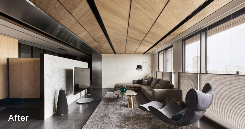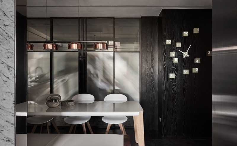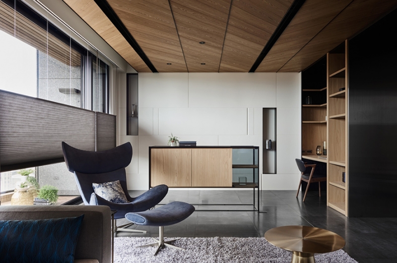 該案中的女主人一開始與Ivy和Amanda溝通的時候,就希望能用明亮整齊的方式處理空間,於是兩位設計師便發揮自己多年的設計經驗,在採光優勢已經發揮極致的情況下,適度使用灰色調、木頭元素及留白的手法,讓高雅及溫暖這兩個看似完全極端的形容詞,能套用在同一個空間中。