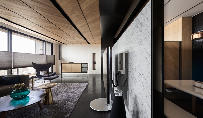 正如我們一開始所談的前情提要,該案的主題性非常明確,因此設計師特別將空間與空間的連結性加深,透過走廊和天花板上的黑色線條,讓每一個空間的主軸最終都會回到「軌跡」。值得一提的是,一進門的玄關特別採取漂浮的方式呈現,為了達到最終的效果,設計師與工程團隊經過長時間的討論,目的就是要讓軌跡的延伸性,從開門的那刻就能有所感受。