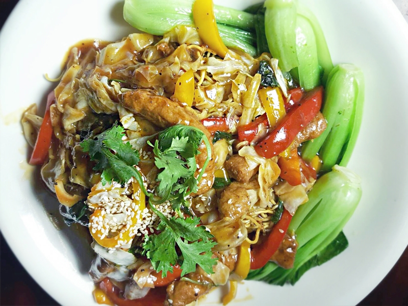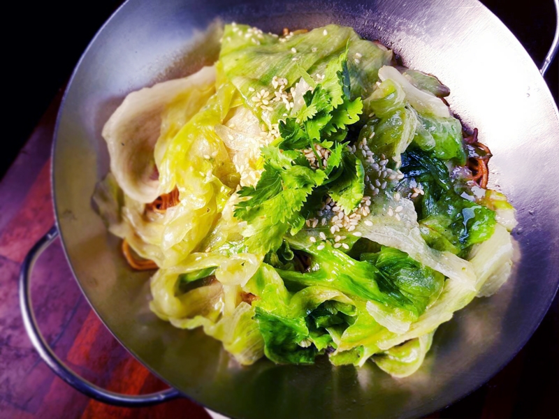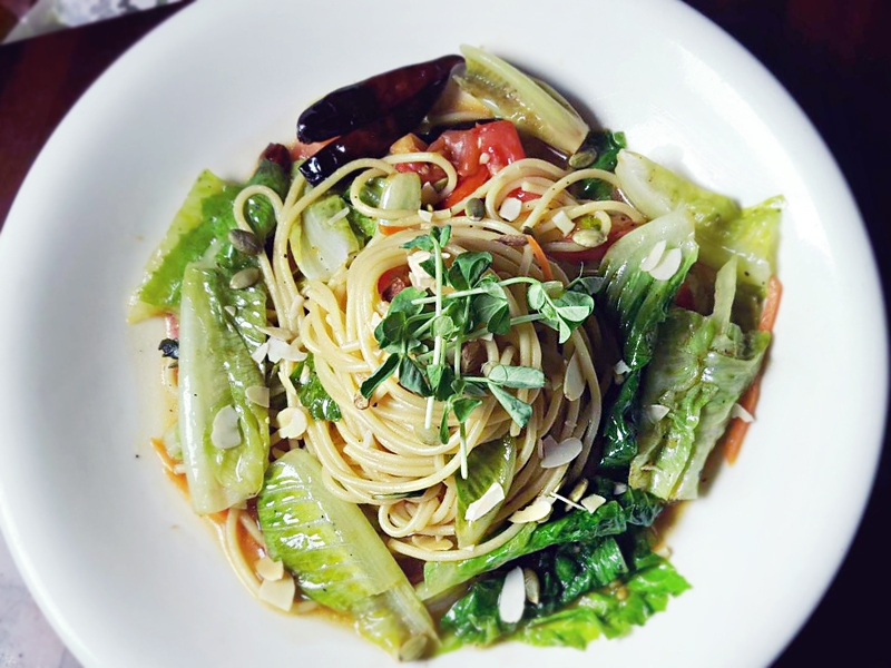 經理說歐洲人義大利麵,喜歡吃自然清爽原味簡單。店家用好的橄欖油、新鮮番茄、乾辣椒快火大炒再加入豐富的食蔬,這道Q彈有勁、香氣十足、蔬菜清脆又帶點微辣的脆脆羅勒辣麵就完成了。看著裘妹吃的津津有味,我都餓了。吃過了清爽型態的義大利麵,接著是重口味系列的港式醬爆麵,主廚特製無蛋廣東細麵條,先煎出麵香,再加入黑胡椒、特製素肉條、辣椒、食蔬快炒煨煮出後,這醬爆迷人的餐點,讓盼姐好喜歡,吃完這種口味的麵食前,經理推薦我們再搭配川燙青菜,就是完美的組合。