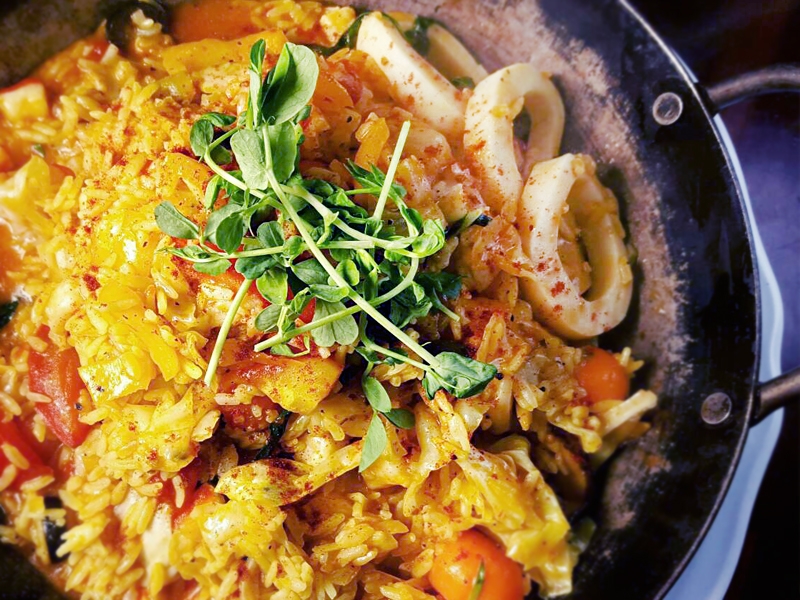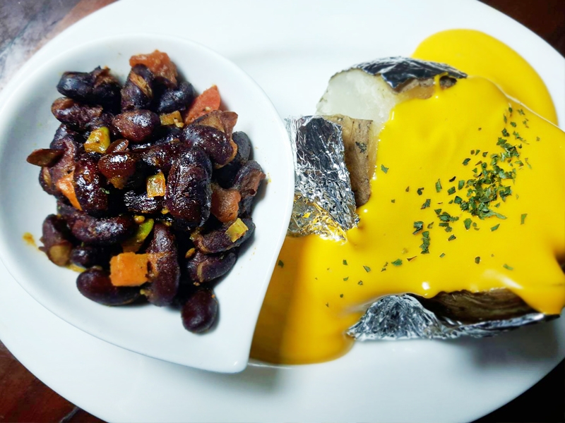 第三道海鮮燉飯,有裘妹喜愛的假墨魚、外型引人入勝用蒟蒻製成的素蝦。粒粒分明香氣直逼油飯的米飯,是生米慢火細燉熬煮。米粒吸附了匈牙利紅辣椒粉和歐洲香料,含少許的黑橄欖將食物的味道層層加分,迸發出這甘醇美味,讓兩位主持人彷彿坐在地中海邊用餐。你以為這樣做很滿足了嗎?裘妹吃了一口紅蘿蔔球,驚喜地說真是甜美,很適合小孩或是不愛紅蘿蔔的人來試試。經理說接下來這道親民美食,要顛覆大家視覺味覺--墨西哥焗烤馬鈴薯,馬鈴薯有大地蘋果之稱,來自於美國鬆軟的馬鈴薯,用海鹽煨過並加入兩種不同口感和香氣的墨西哥起司,超濃郁的口感,讓裘妹移情別戀了,愛上這道美好的美食,盼姐說再搭配主廚精選的辣紅腰果佐義式香料,讓人有戀愛般的滋味。