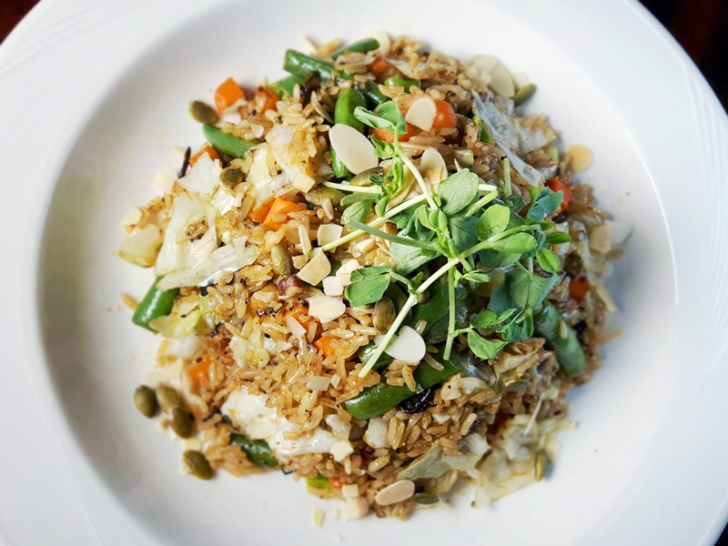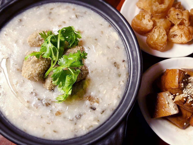港式粥品,主廚運用優質蛋白質腐竹和百果髮菜絲文火煲煮,保留食物清香淡雅暖胃,適合小孩和長輩享用,粥品上層再搭上豆腐和海苔特調做成蚵仔酥,真的口齒留香,吃粥一定要配小菜,今天的小菜用八角肉桂五香花椒滷豆乾和素蹄筋,上層灑點白芝麻平凡的小菜讓人一口接一口。熱食的最終曲-港式美生菜撈麵,清脆爽口的美生菜,搭特製麵體無蛋港式麵條,麵條經過水煮至軟Q,再兌入香港醬油王,醬香味將這道餐點昇華到有酒氣的香味,只能讚嘆廚師精湛的廚藝。