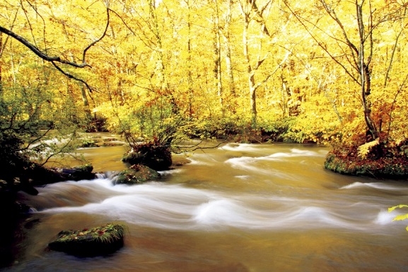 【紅葉見頃10月下旬】 可以欣賞千變萬化的溪流美與14個風情不同的瀑布、是日本首屈一指的景勝地。山毛櫸、槭樹、楓樹等等轉紅轉黃的色調各有不同,妝點著秋色變得更鮮艷了。沿著溪谷步道健行很舒服,也推薦騎自行車。