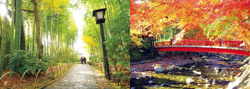 【紅葉見頃11月中旬~12月上旬】 竹林整年都是綠的,秋天時從綠竹林的深處看見錯落的紅葉,襯著鮮豔的紅色更加搶眼。變色的楓樹與朱紅色的桂橋景色是最適合留下倩影的地方。溫泉街的古刹・修禪寺在11月18日(六)~30日(四)的紅葉最盛期間也會特別開放庭園供民眾付費參觀。