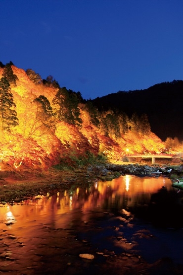 【紅葉見頃11月中旬~下旬】 東海地方首屈一指的紅葉景點。只有在11月才看得到飯盛山的槭樹有夜間點燈,和白天整山染成金黃色的景象有著非常不同的氛圍。此外、從巴橋上望向待月橋與巴川水面照映出約4000株槭樹的風情也很美。