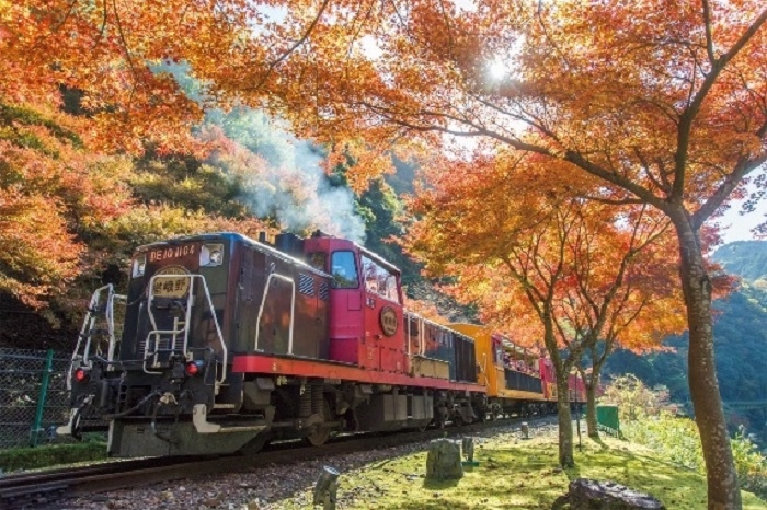 【紅葉見頃11月中旬~12月上旬】 搭乘沿著保津川溪谷前進、從嵐山到龜岡約25分鐘左右的嵯峨野遊覽小火車賞紅葉也是非常有趣。槭樹、楓樹、銀杏、漆樹等各色的紅葉像是迎賓拱廊一般歡迎遊客的到來。小火車就是要享受沒有窗玻璃隔絕室內外、在穿越隧道與樹林時不僅看到植物在你眼前、還能聞到真實的氣味,這可說是搭小火車的醍醐味呀。