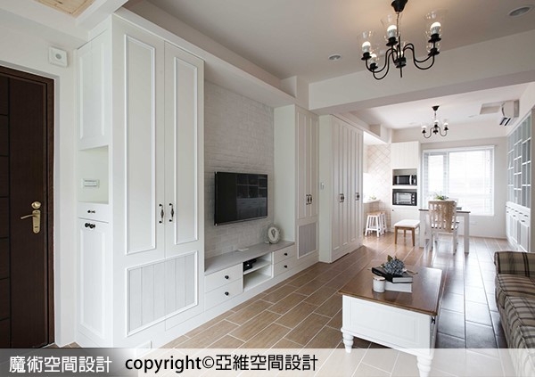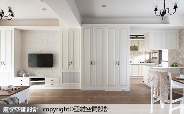 本案原始格局不良且樑柱多,亞維空間設計拆除隔間重塑開放式新局,優化採光及動線,並以連續牆櫃造型,交替真假櫃門,整合收納、修飾柱體及遮蔽隔屏等功能,完美展現純淨新貌。