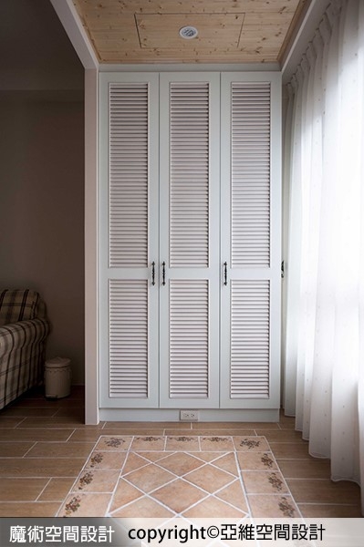 1.新規劃的概念式玄關,以天花板區塊與地坪復古磚圍塑,搭佐透氣通風的百葉門鞋櫃,避免過度切割空間仍可發揮實質功能。