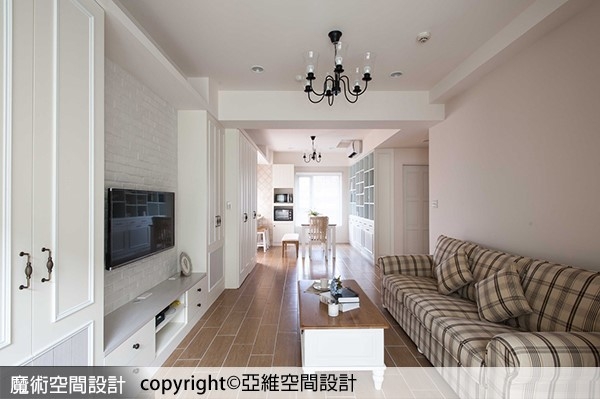 ▲格局重塑後開啟雙向採光,輔以白色電視櫃、木紋磚、鄉村風家具等陳設,讓客廳顯得明亮純淨。
