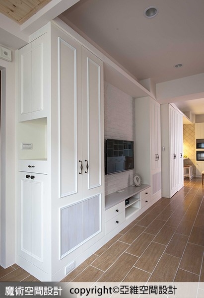 4.簡瑋琪設計師延伸電視櫃精造的雙白櫃,左側為收納櫃,右側則為修飾造型隔板,用來遮擋冰箱。