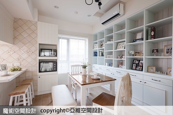 2.簡瑋琪設計師考量平日用餐人口單純,於餐廳與廚房間設置用餐吧檯,讓餐廳切換為書房功能,若有訪客或正式用餐需求,仍可回復為餐敘用途,餐桌兼具書桌、展示書櫃也是餐具櫃,機能疊合坪效雙倍。