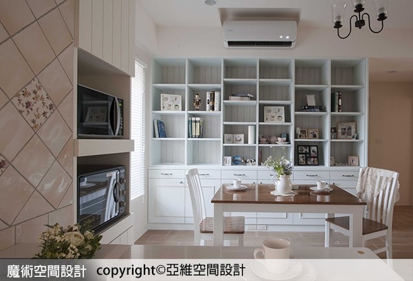 ▲靠牆大型展示書櫃,將餐具及庶物收納都一併整合,富含人文美學與務實精神。