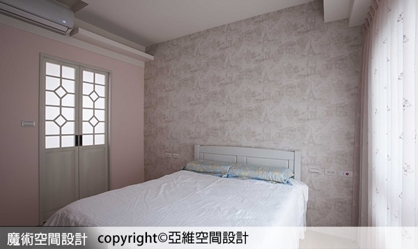 ▲主臥睡眠空間力求清爽,主牆鋪陳淡色典雅壁紙,床側造型門內為更衣室。