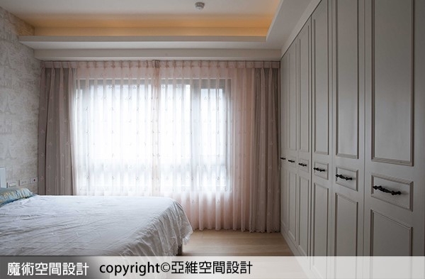 7.主臥睡眠空間力求清爽,除規劃更衣室外,仍利用床尾處畸零空間增設衣櫥,擴充收納能力也讓房內空間齊整。