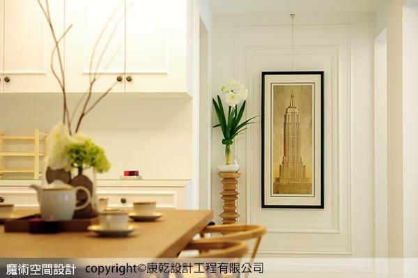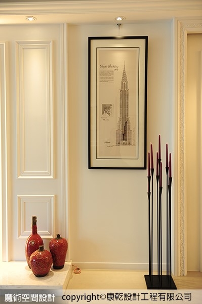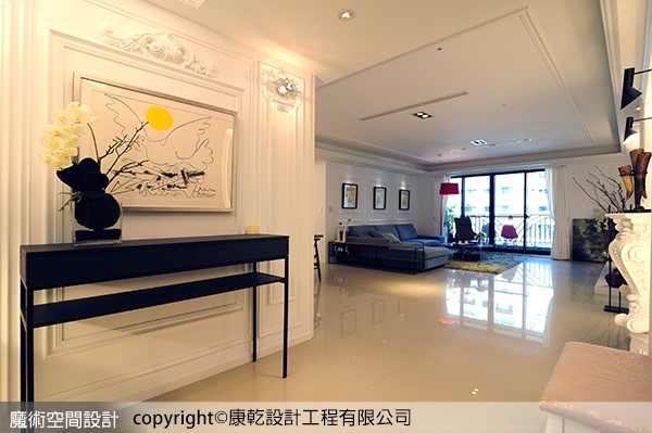 康乾設計發揮65坪大宅器度,藝術般場景的遼闊大廳,薈萃獨具特色的家具陳設和畫作,激盪出混搭不凡的氣韻。由古典線板與雕花的玄關端景開啟全室華麗的空間扉頁。