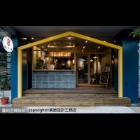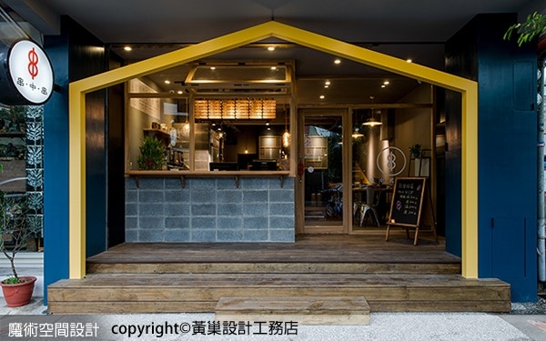 1.黃巢設計工務店以攤車造型及玻璃牆圍塑門面,打造店家與顧客近乎零距離的互動,為了吸引人流眼球,藍色外牆襯托黃色造型屋框,強力圈點出入口意象,新穎的設計風格,讓人難以抗拒的創新美食召喚。