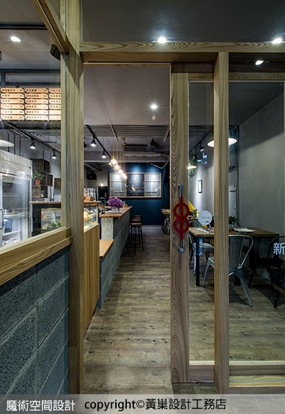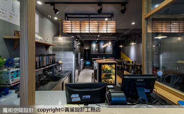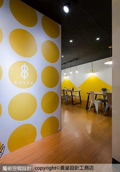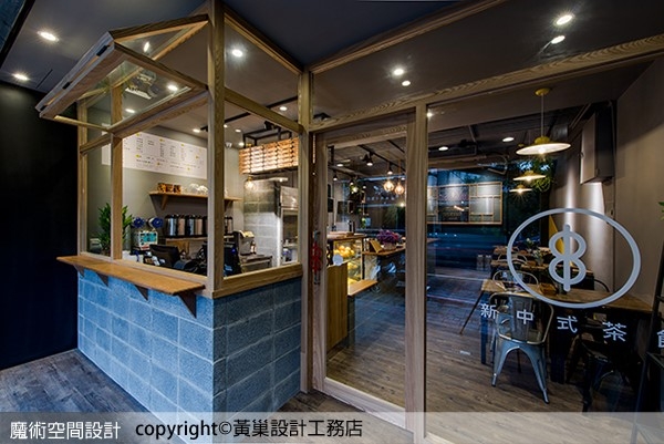 黃巢設計為中式茶館打造的商空設計,結合外帶茶飲的便利性與內用美食的舒適度,以玻璃、空心磚、木質打造粗中帶細的質感,以藍、灰、黃色彩的組合搭配,揮灑無限創意開啟歡樂美食的外掛新模式。