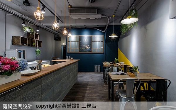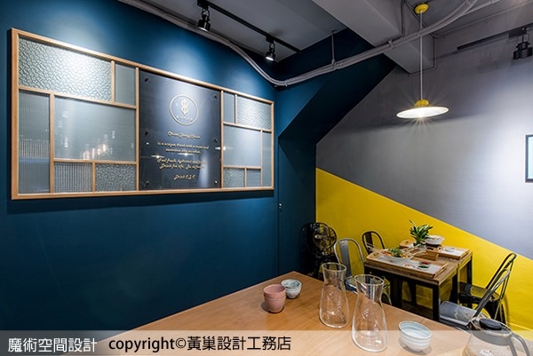 4.裸裎天花板刷色處理,立面也以灰、黃、藍為主色,揮灑出工業風設計感,藍底牆面上以不同紋理玻璃拼組成木框掛飾,書寫了店家小故事與店名LOGO。